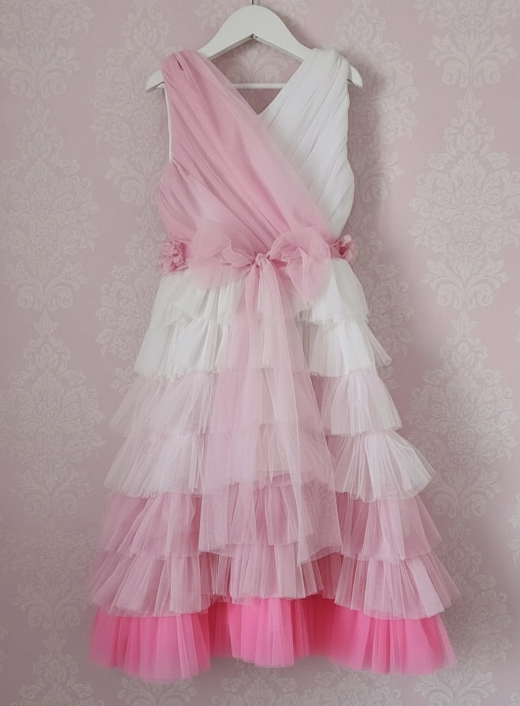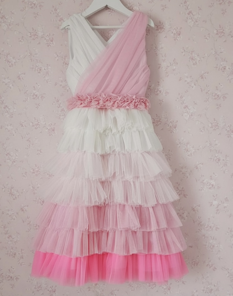 Imeilus ning ääretult silmapaistev pehmest tüllist pidulik kleit, mis sobib ideaalselt lasteaia lõpukleidiks või muuks pidulikuks sündmuseks.